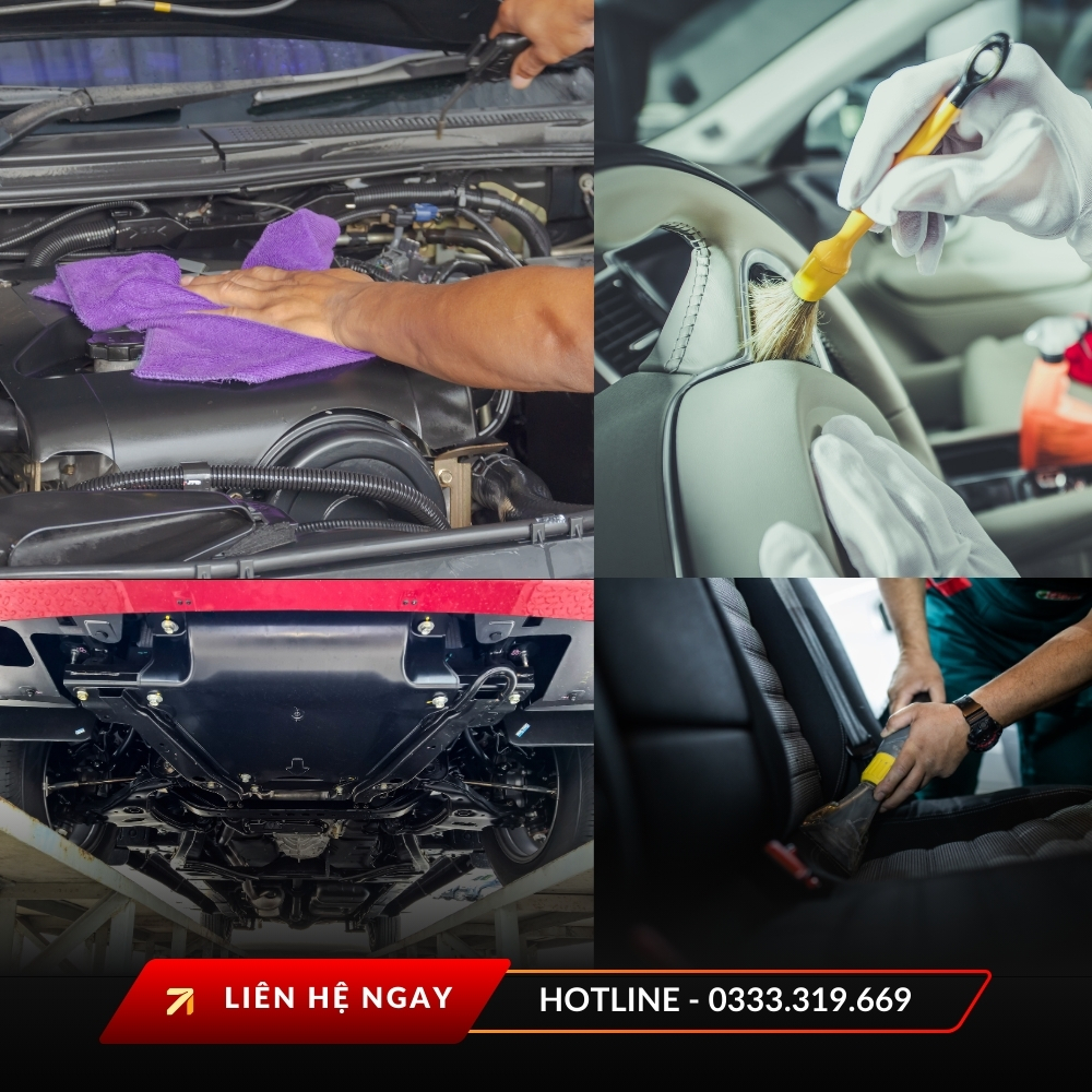 | 2. Vệ sinh nội thất | Hút bụi – giặt ghế – vệ sinh trần, taplo, sàn – xử lý các vết bẩn cứng đầu. |